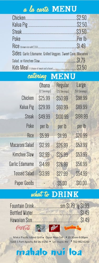 Introducing the menu at Makai Pacific Island Grill, a casual and wheelchair accessible restaurant in Las Vegas. This island-inspired spot offers a wide range of options for vegetarians and meat-lovers alike. From fresh chicken wings and katsu to flavorful teriyaki chicken and kalua pork, their menu is sure to satisfy every craving. Customers rave about the delicious macaroni salad and kimchi slaw that perfectly complement the dishes. With options for delivery, takeout, reservations, and catering, Makai Pacific Island Grill is a versatile dining destination. The friendly staff and excellent customer service make every visit a memorable experience. Don't miss out on the Mochico chicken and steak dishes, which have been fan favorites for years. Come explore the unique flavors of the Pacific Islands at Makai Pacific Island Grill today.
